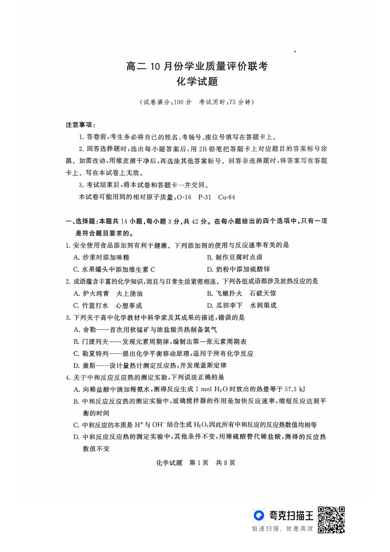 高二化学+答案--山西省2025-2026学年高二T8联考10月份学业质量评价联考
