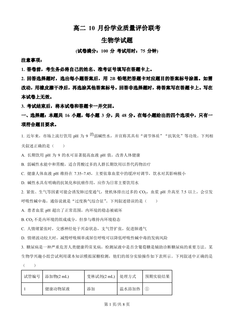 高二生物(原卷版)--山西省2025-2026学年高二T8联考10月份学业质量评价联考