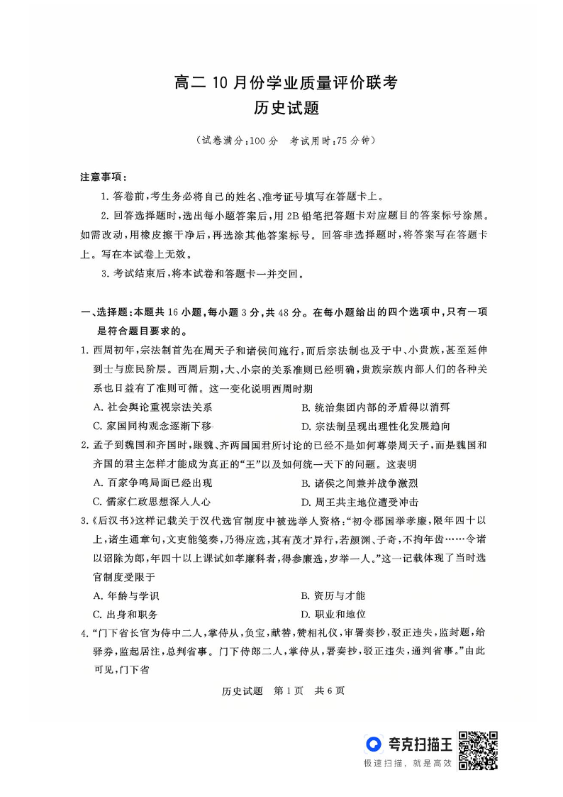 高二历史+答案--山西省2025-2026学年高二T8联考10月份学业质量评价联考