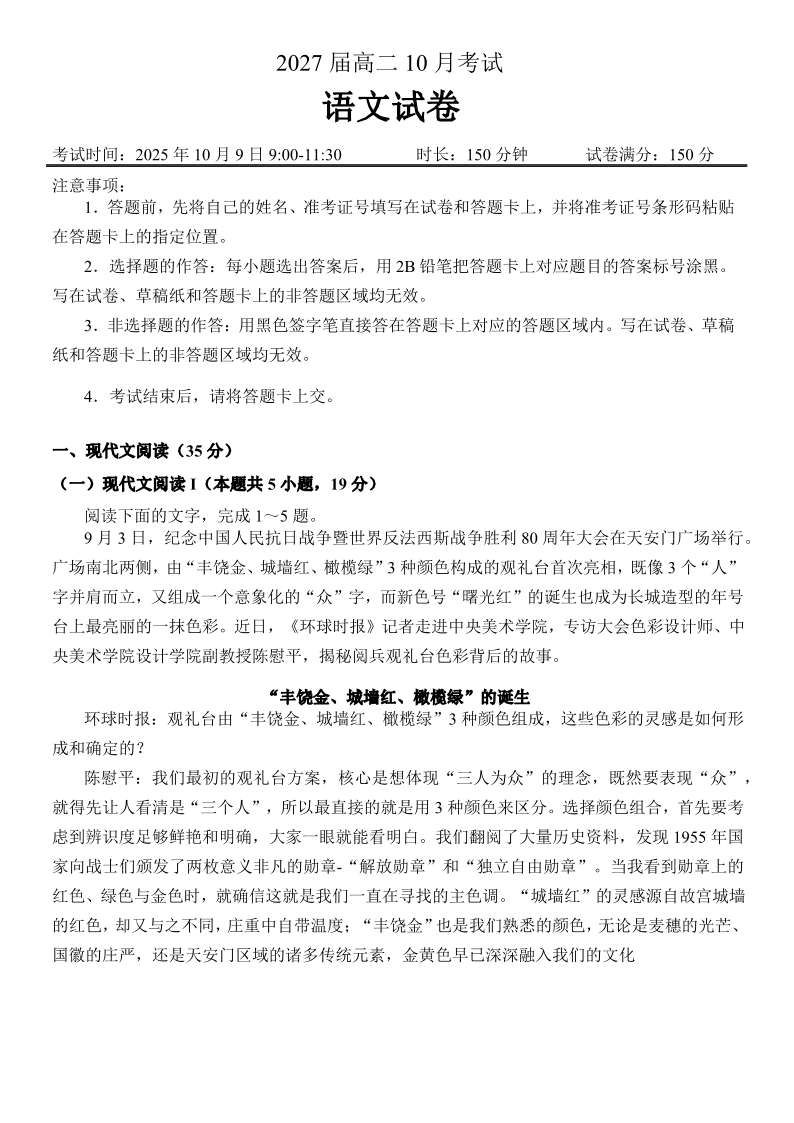高二语文--湖北省云学联盟2025-2026学年高二上学期10月月考