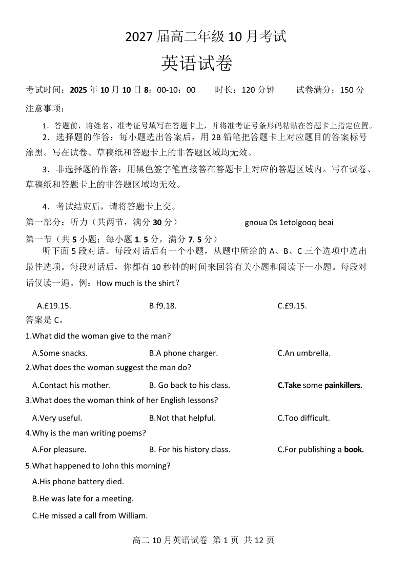 高二英语--湖北省云学联盟2025-2026学年高二上学期10月月考