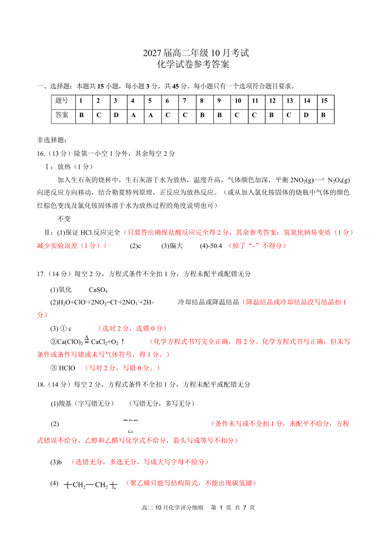 高二化学答案--湖北省云学联盟2025-2026学年高二上学期10月月考
