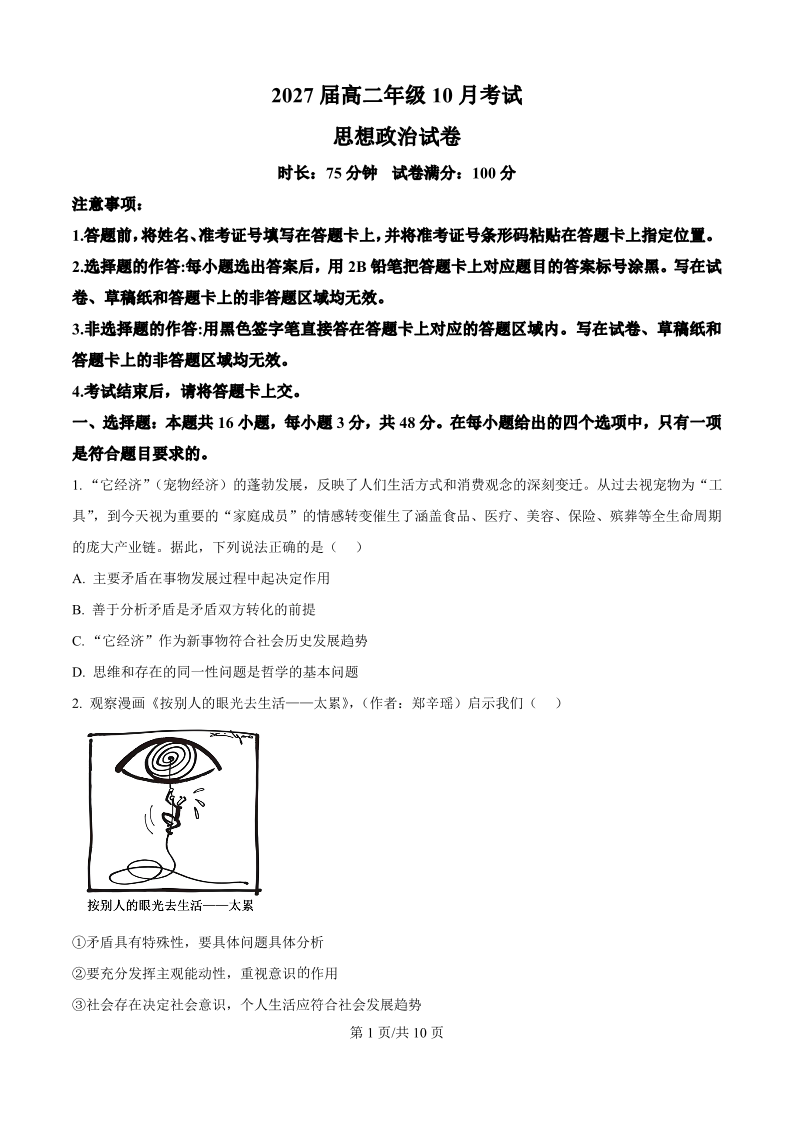 高二政治+答案--湖北省云学联盟2025-2026学年高二上学期10月月考