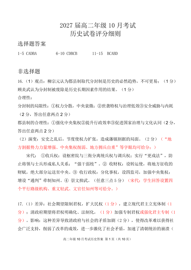 高二历史答案--湖北省云学联盟2025-2026学年高二上学期10月月考
