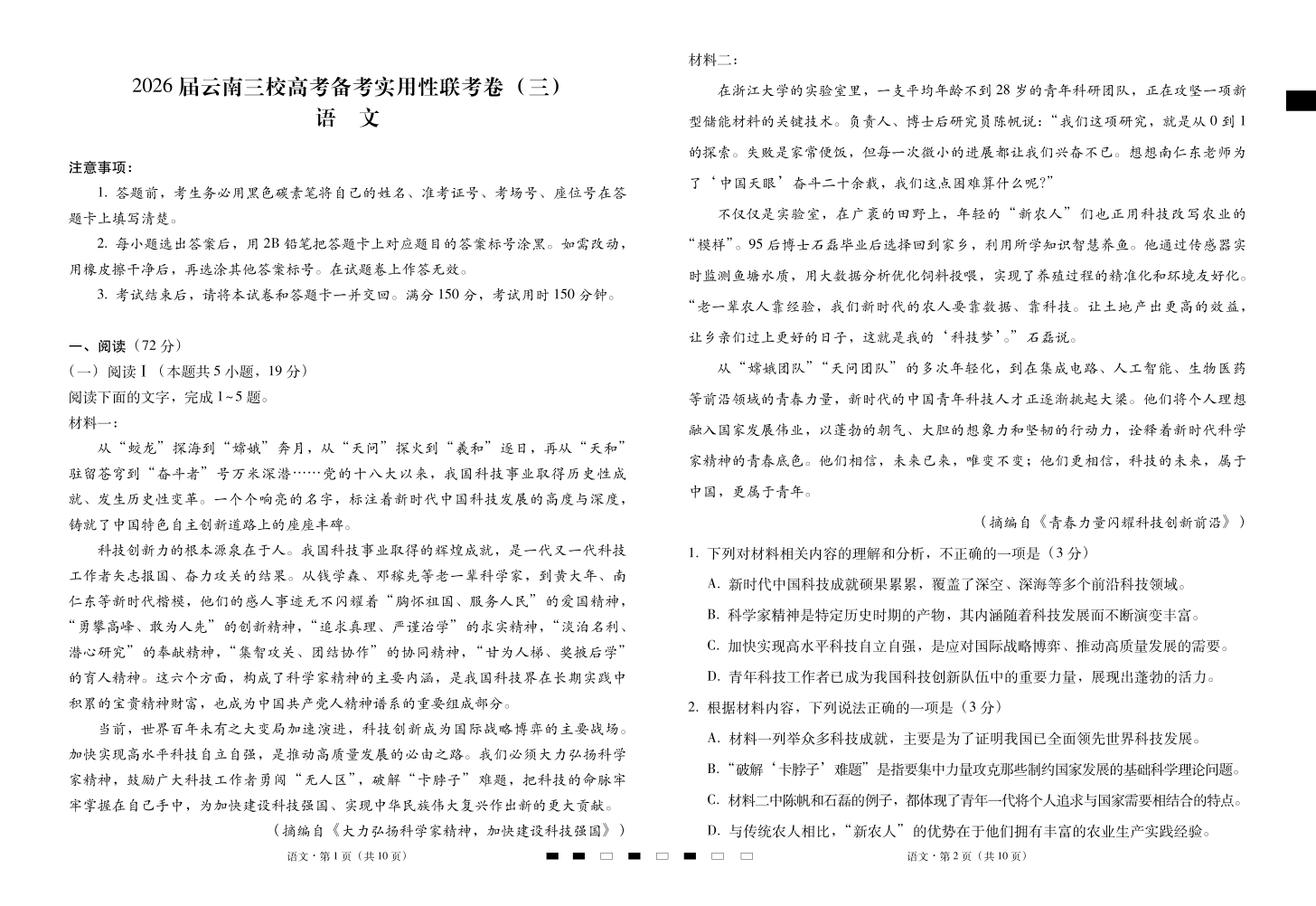 高三语文--云南省三校2026届高考备考实用性联考卷(三)