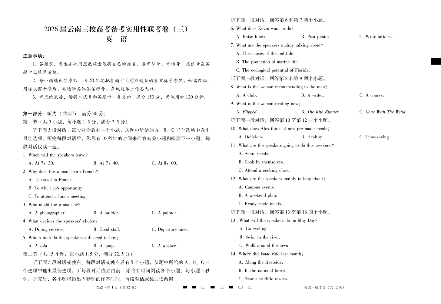 高三英语--云南省三校2026届高考备考实用性联考卷(三)