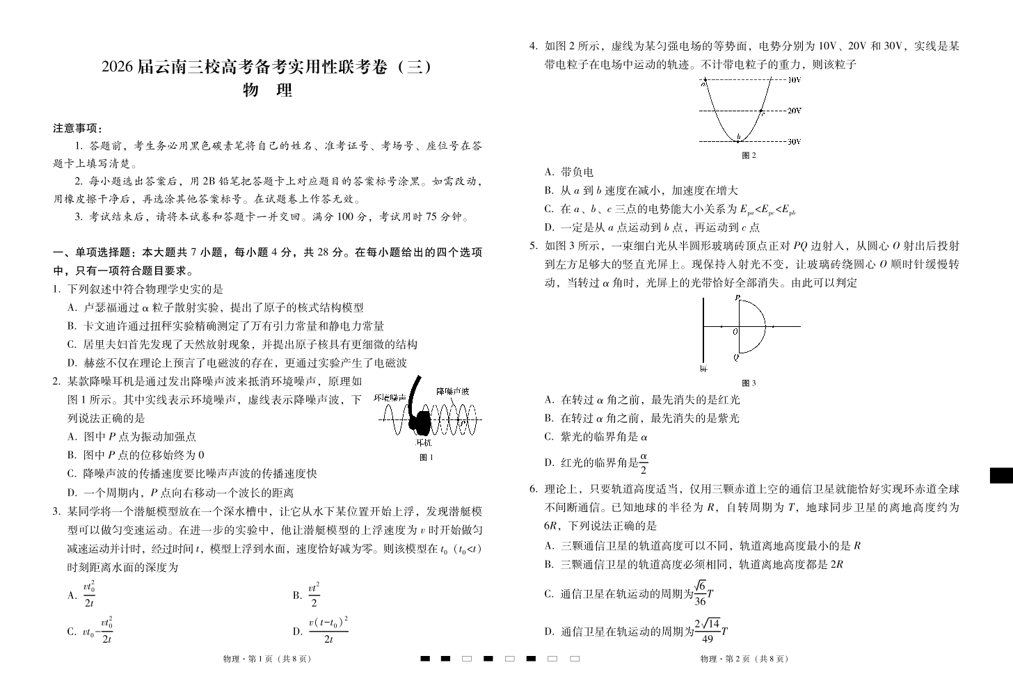 高三物理--云南省三校2026届高考备考实用性联考卷(三)