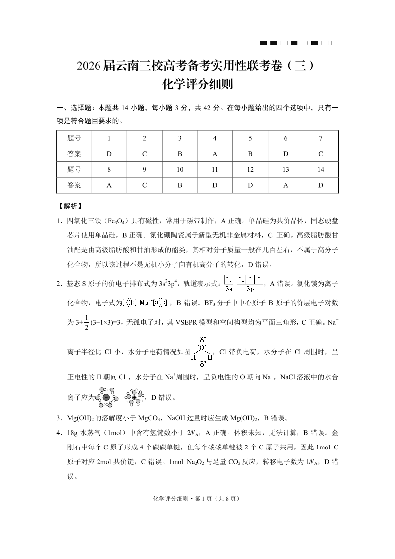 高三化学答案--云南省三校2026届高考备考实用性联考卷(三)