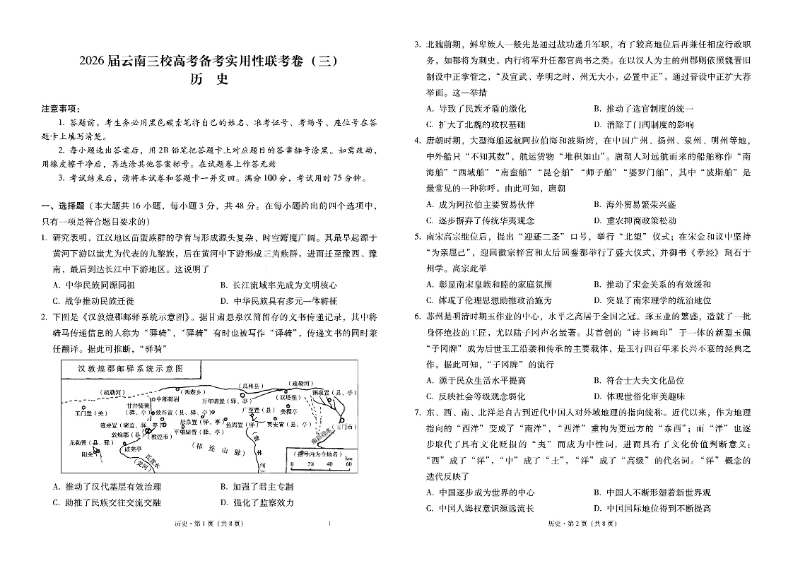 高三历史--云南省三校2026届高考备考实用性联考卷(三)