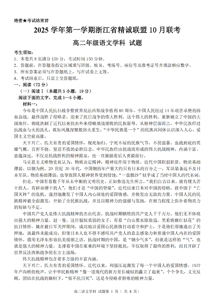 高二语文--浙江精诚联盟2025-2026学年高二上学期10月联考