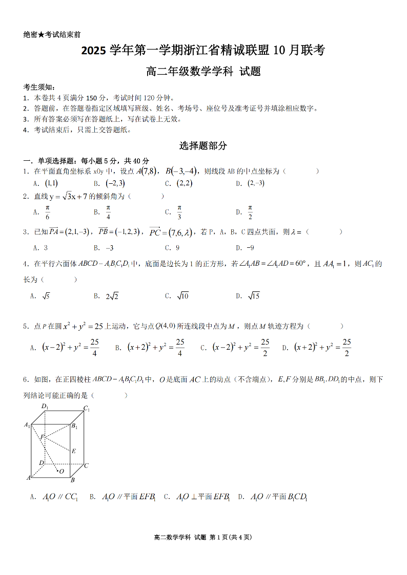 高二数学--浙江精诚联盟2025-2026学年高二上学期10月联考