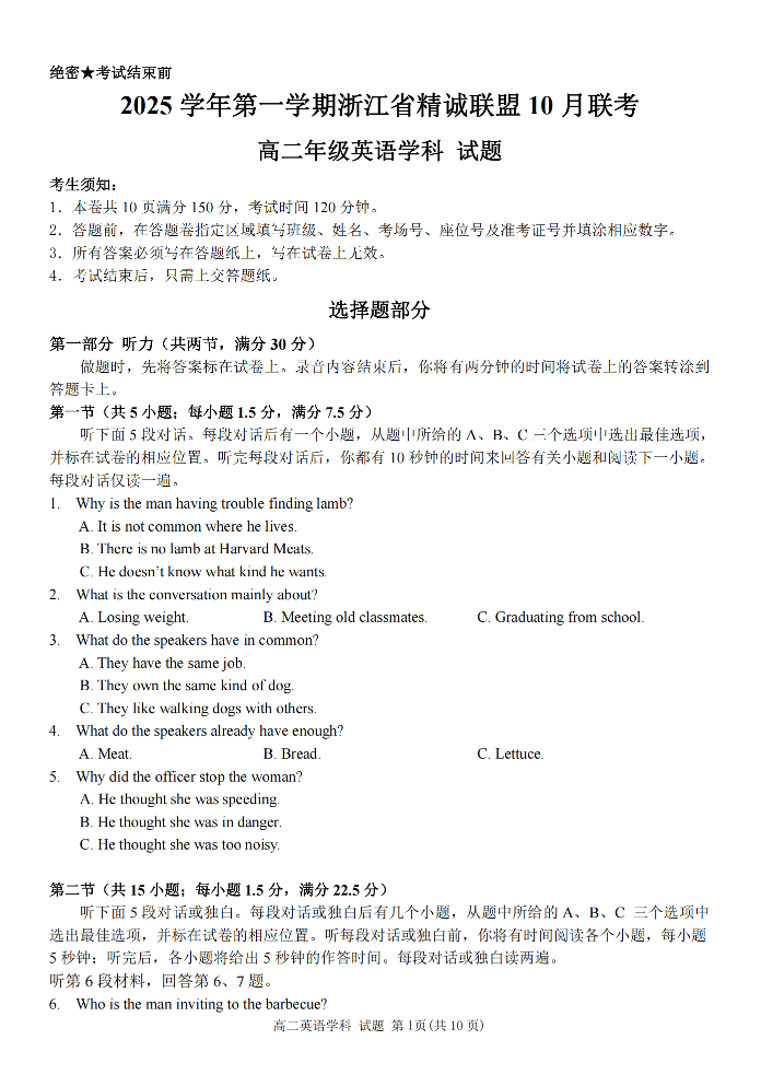 高二英语--浙江精诚联盟2025-2026学年高二上学期10月联考