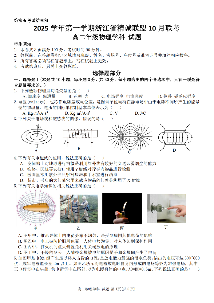 高二物理--浙江精诚联盟2025-2026学年高二上学期10月联考