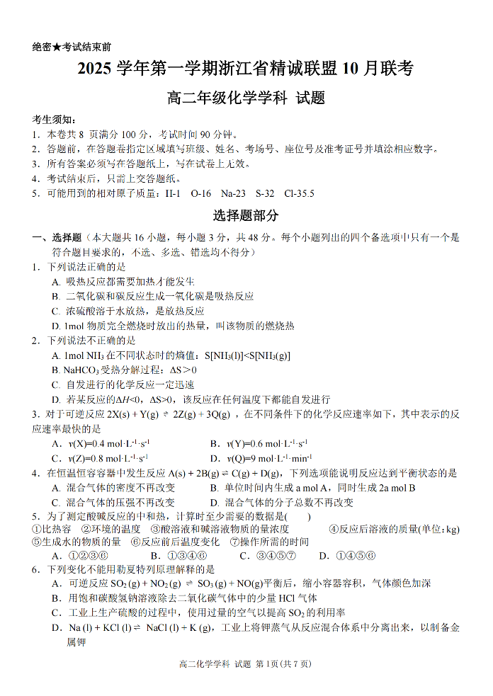 高二化学--浙江精诚联盟2025-2026学年高二上学期10月联考