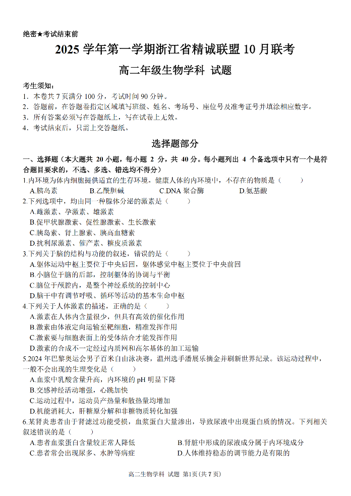 高二生物--浙江精诚联盟2025-2026学年高二上学期10月联考
