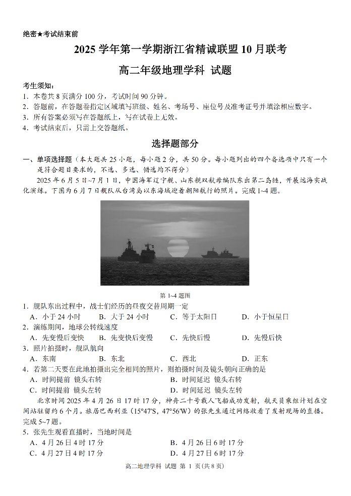 高二地理--浙江精诚联盟2025-2026学年高二上学期10月联考