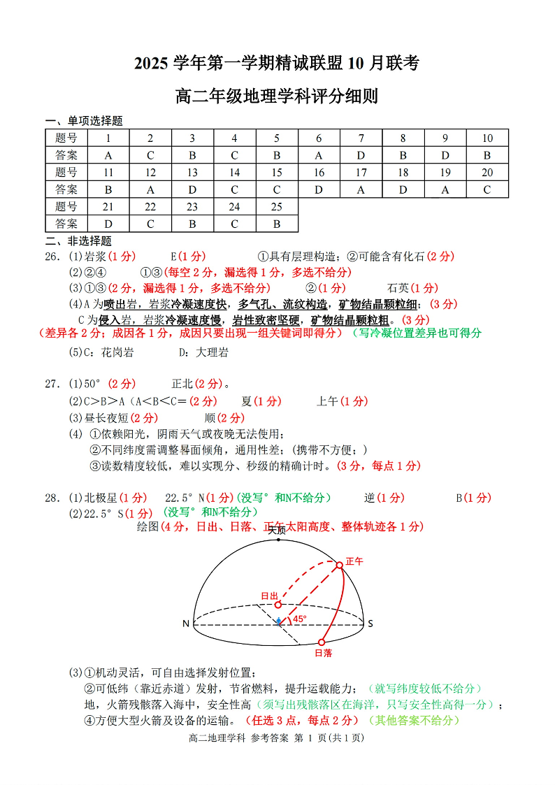 高二地理答案--浙江精诚联盟2025-2026学年高二上学期10月联考