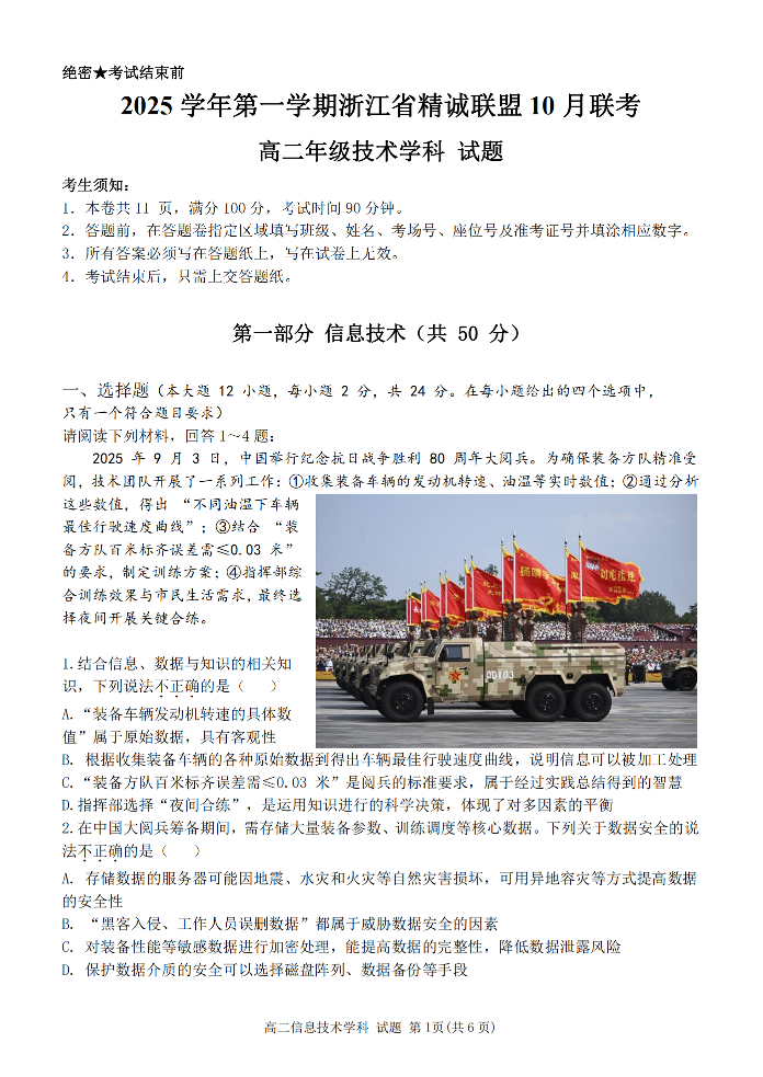 高二技术--浙江精诚联盟2025-2026学年高二上学期10月联考