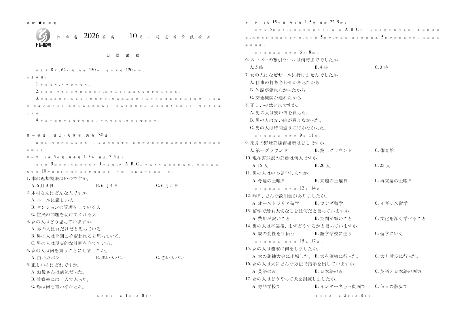 高三日语--江西省上进联考2026届高三10月一轮复习阶段检测