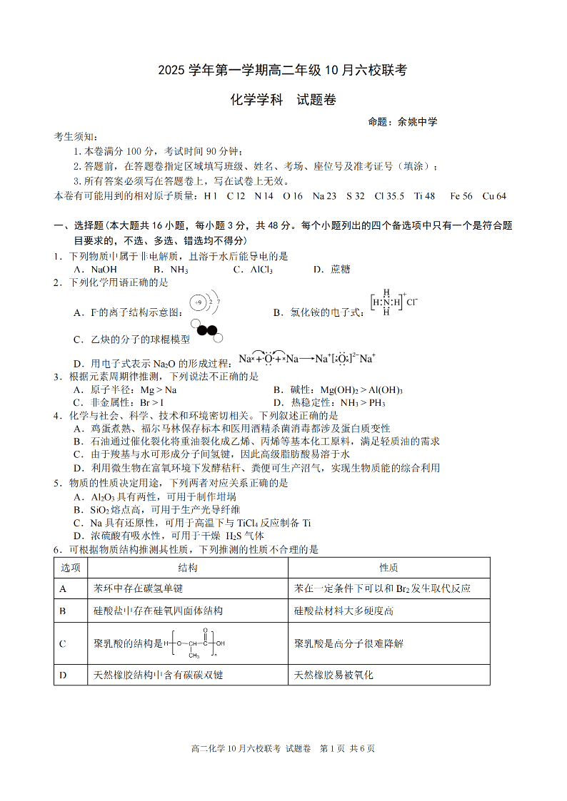 高二化学--浙江省六校联盟2025-2026学年高二上学期10月月考