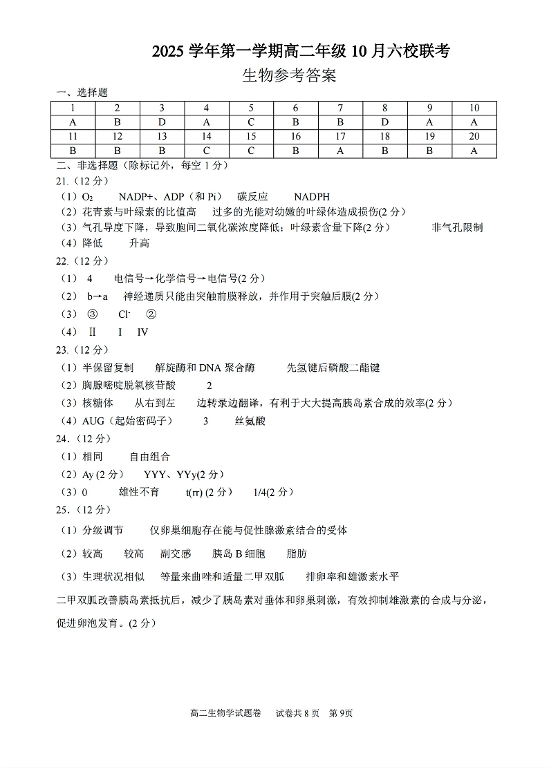 高二生物答案--浙江省六校联盟2025-2026学年高二上学期10月月考