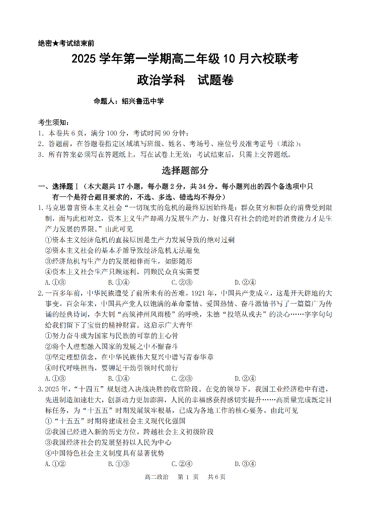 高二政治--浙江省六校联盟2025-2026学年高二上学期10月月考