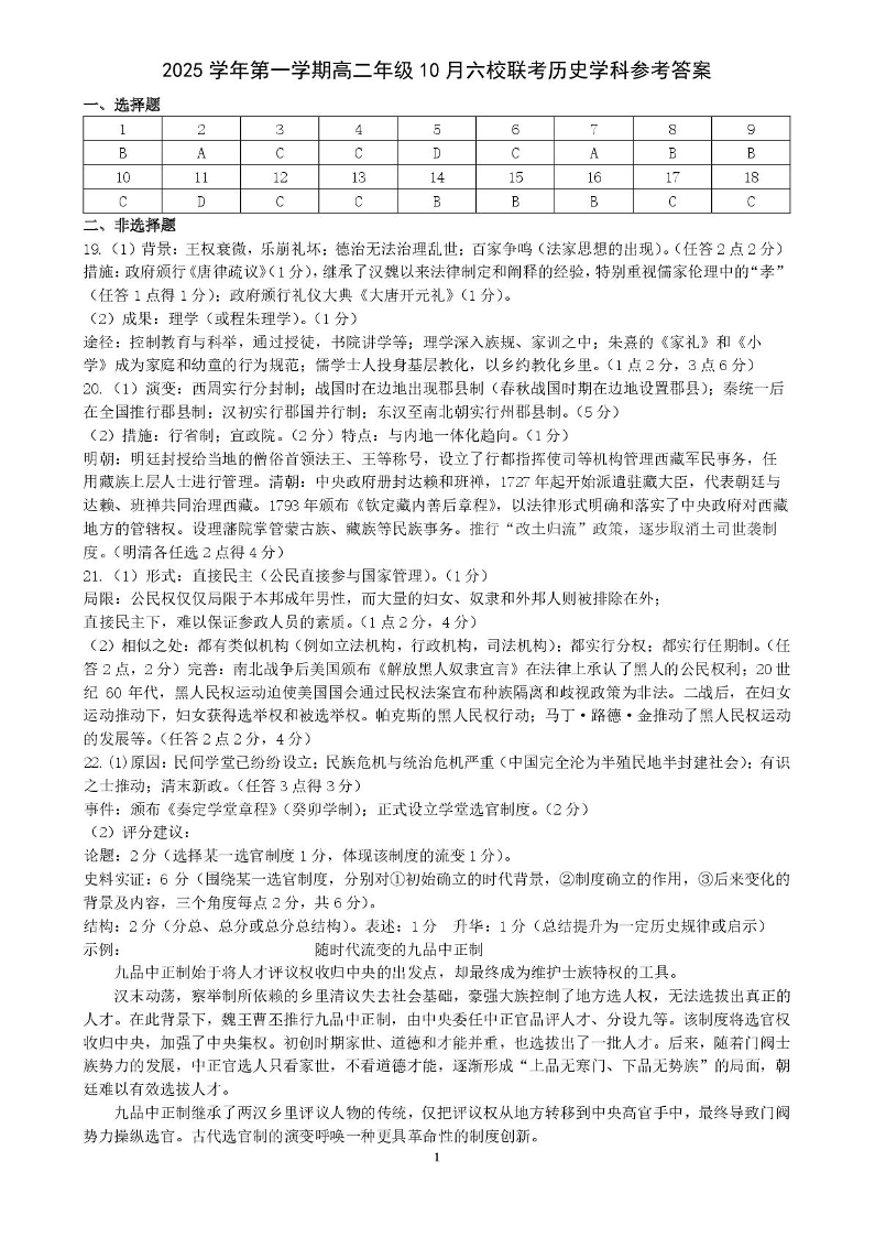 高二历史答案--浙江省六校联盟2025-2026学年高二上学期10月月考
