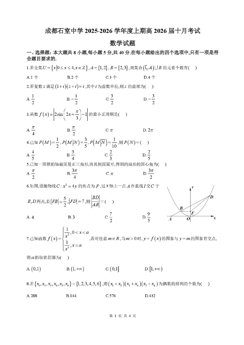 高三数学--四川省成都市石室中学2026届高三上学期10月月考