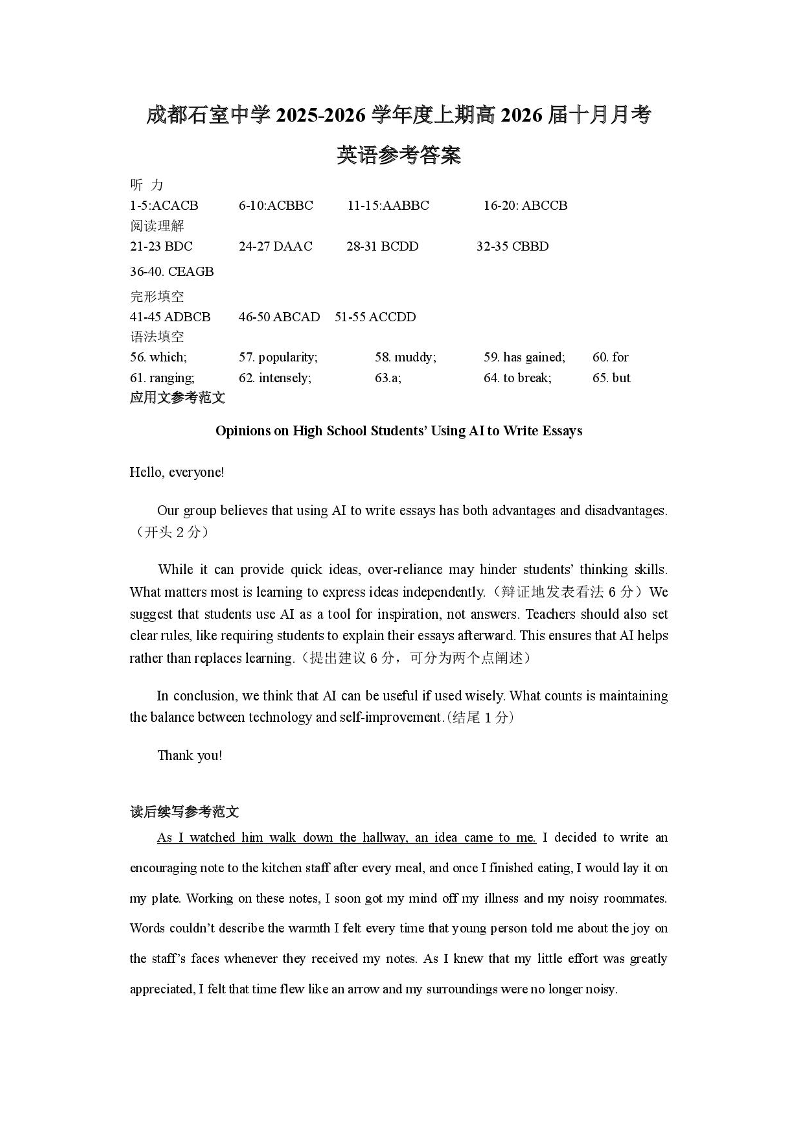 高三英语答案--四川省成都市石室中学2026届高三上学期10月月考
