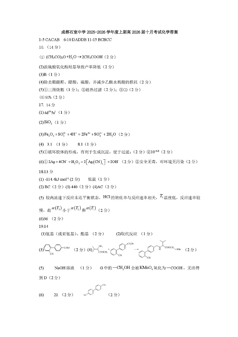 高三化学答案--四川省成都市石室中学2026届高三上学期10月月考