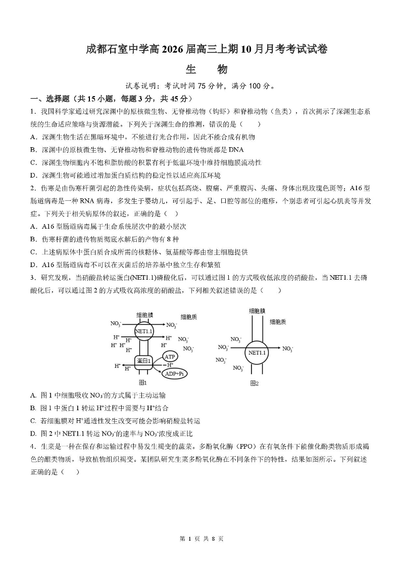 高三生物--四川省成都市石室中学2026届高三上学期10月月考