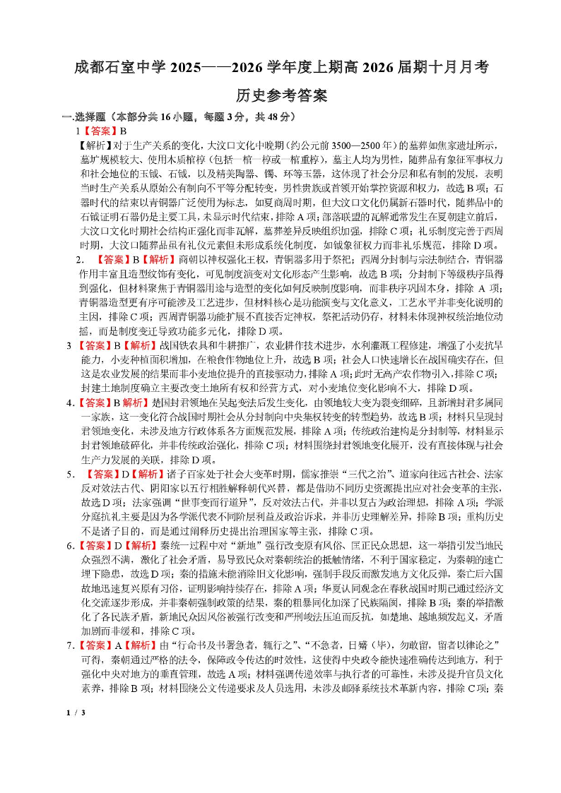 高三历史答案--四川省成都市石室中学2026届高三上学期10月月考