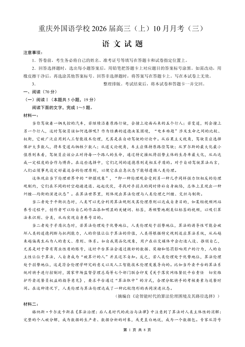 高三语文--重庆市外国语学校2026届10月月考(三)
