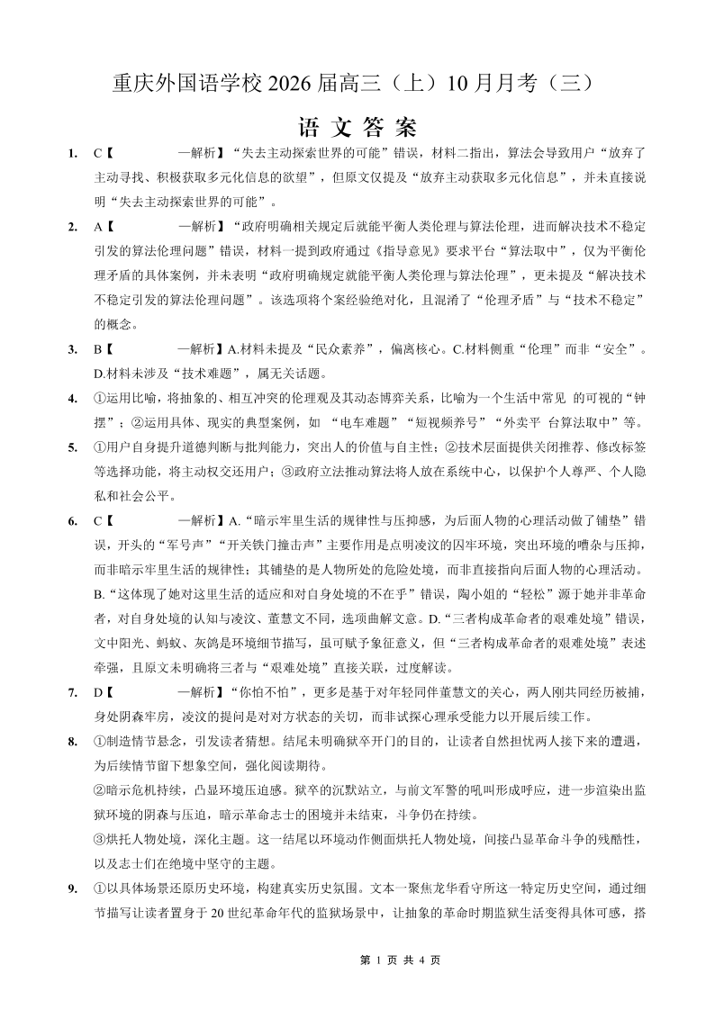 高三语文答案--重庆市外国语学校2026届10月月考(三)
