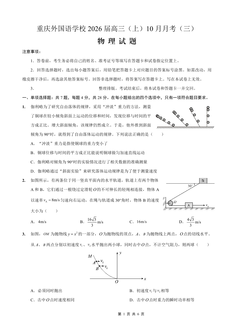 高三物理--重庆市外国语学校2026届10月月考(三)