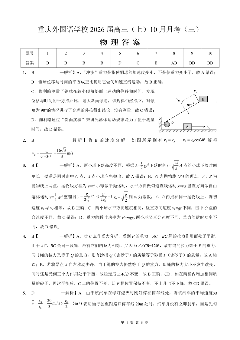 高三物理答案--重庆市外国语学校2026届10月月考(三)