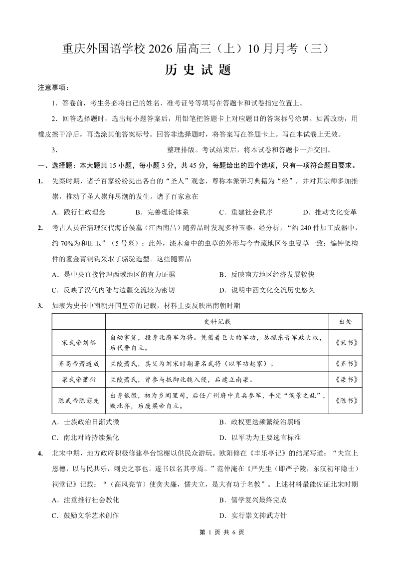 高三历史--重庆市外国语学校2026届10月月考(三)