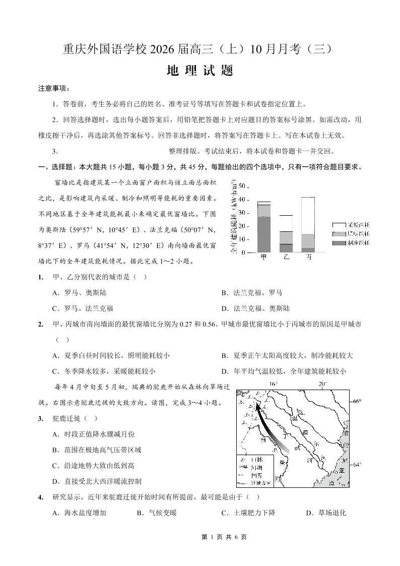 高三地理--重庆市外国语学校2026届10月月考(三)