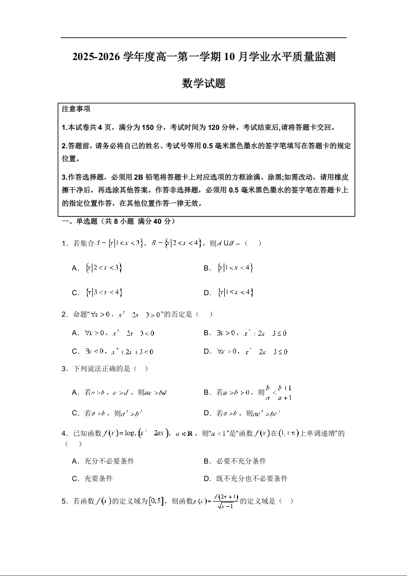高一数学--江苏省连云港市赣榆区新海高级中学2025-2026学年高一上学期10月学业水平质量监测