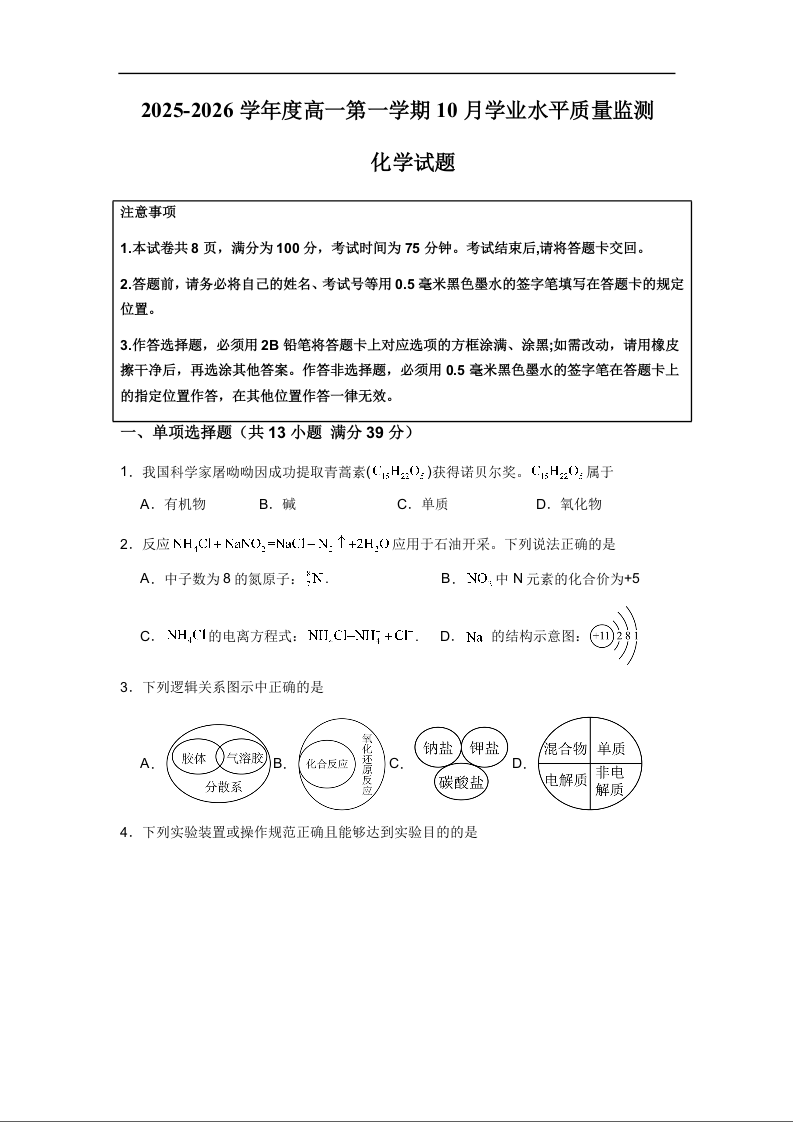高一化学--江苏省连云港市赣榆区新海高级中学2025-2026学年高一上学期10月学业水平质量监测