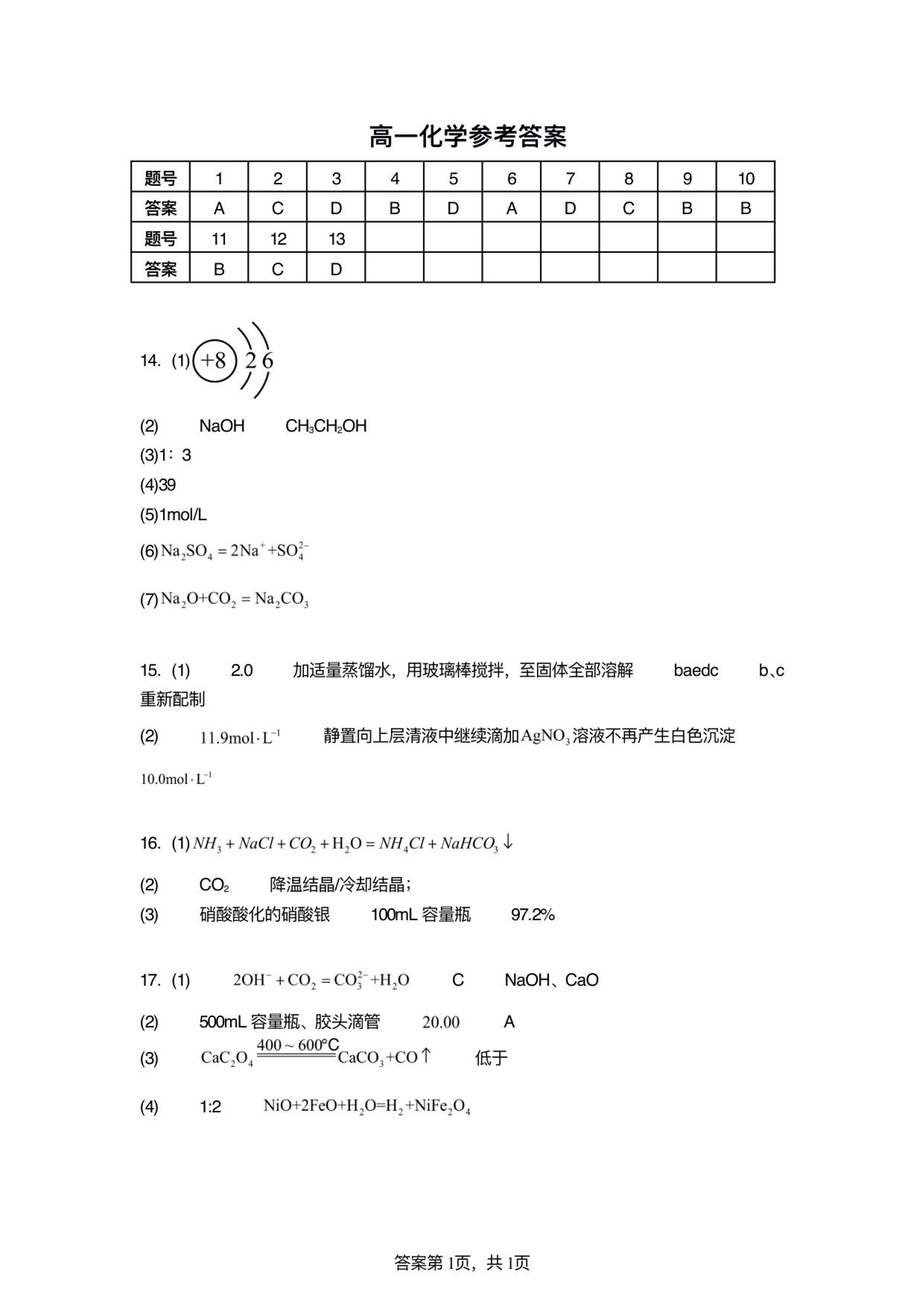 高一化学答案--江苏省连云港市赣榆区新海高级中学2025-2026学年高一上学期10月学业水平质量监测