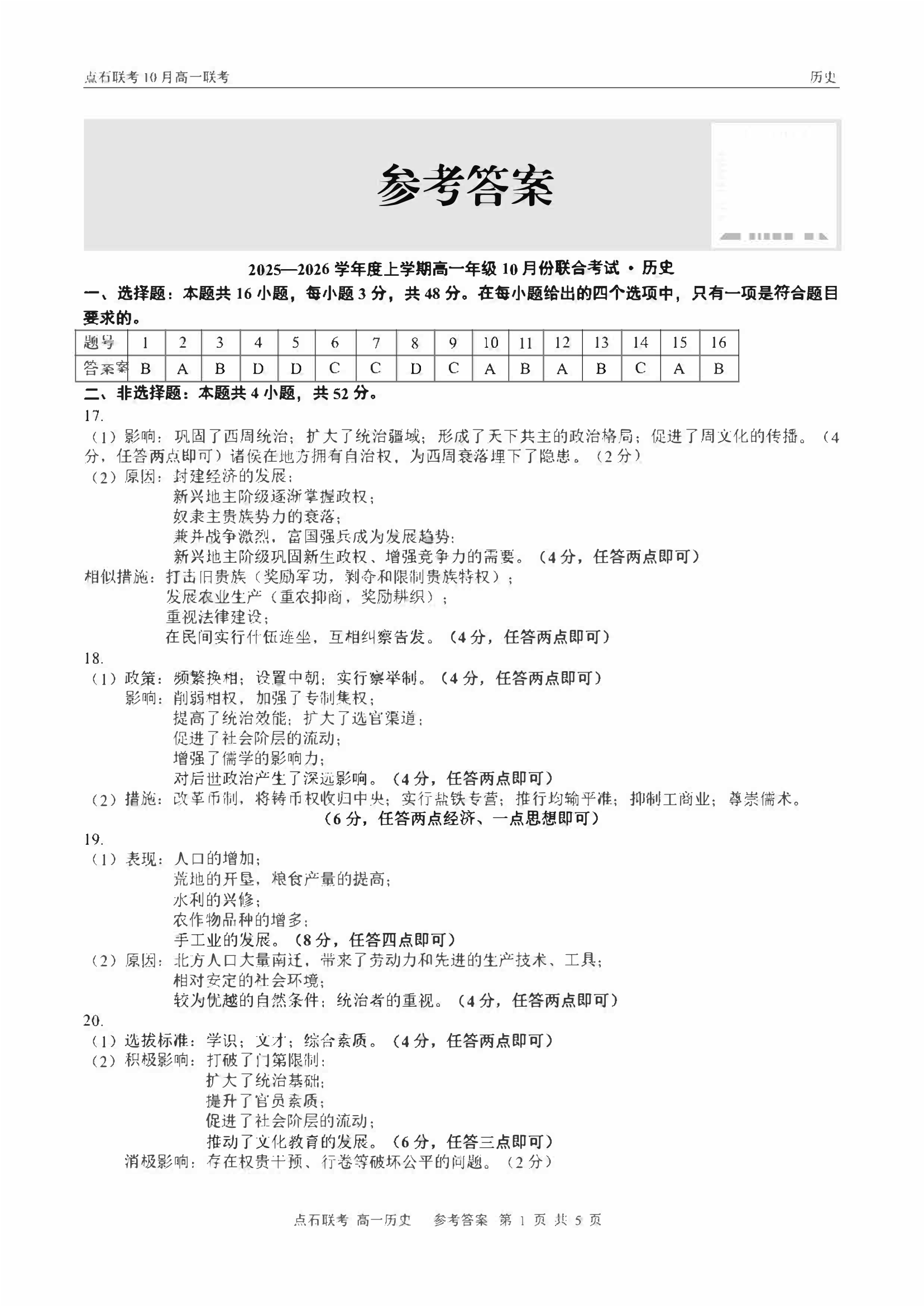 高一历史答案--辽宁省点石联考2025-2026学年高一上学期10月联考
