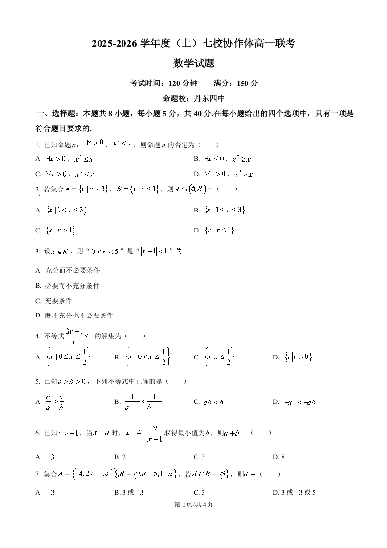 高一数学 (原卷版)--辽宁省七校协作体2025-2026学年高一上学期10月联考