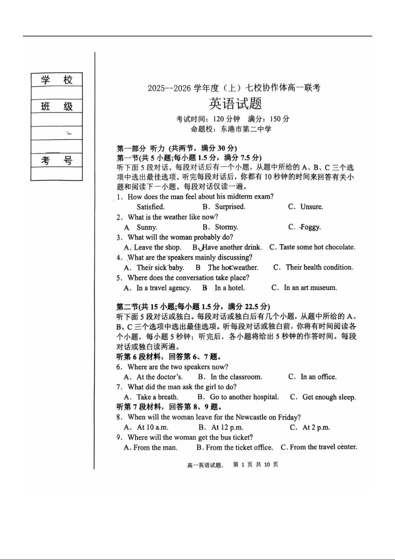高一英语--辽宁省七校协作体2025-2026学年高一上学期10月联考