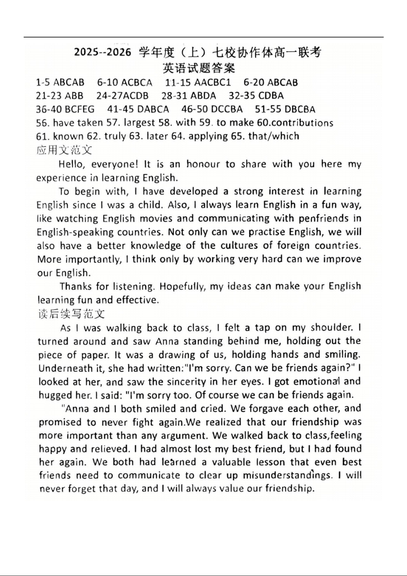 高一英语答案--辽宁省七校协作体2025-2026学年高一上学期10月联考