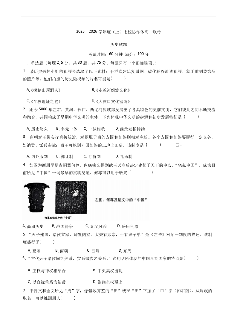 高一历史+答案--辽宁省七校协作体2025-2026学年高一上学期10月联考