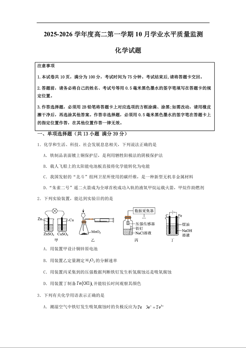 高二化学--江苏省连云港市赣榆区新海高级中学2025-2026学年高二上学期10月学业水平质量监测
