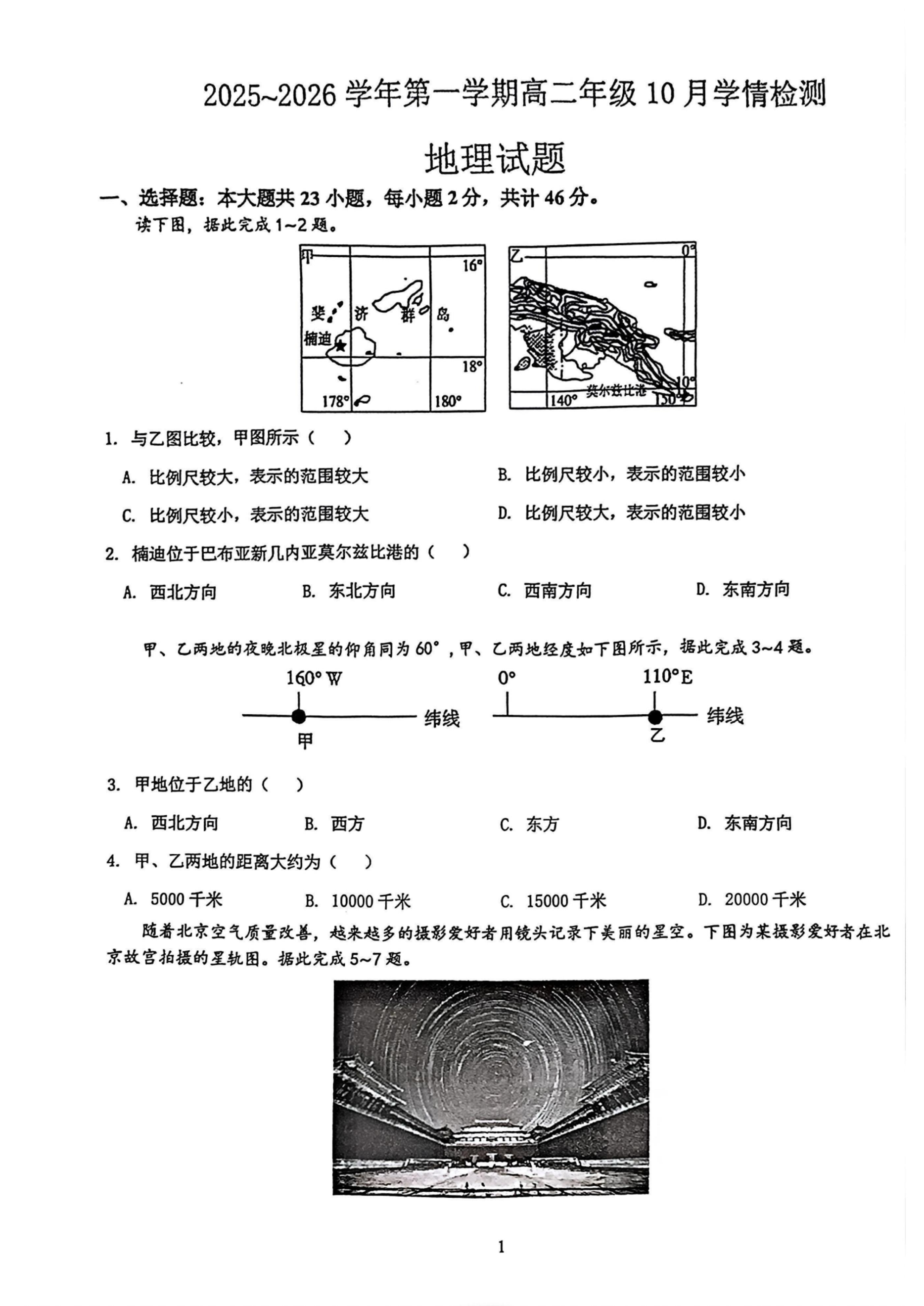 高二地理--江苏省连云港市赣榆区新海高级中学2025-2026学年高二上学期10月学业水平质量监测