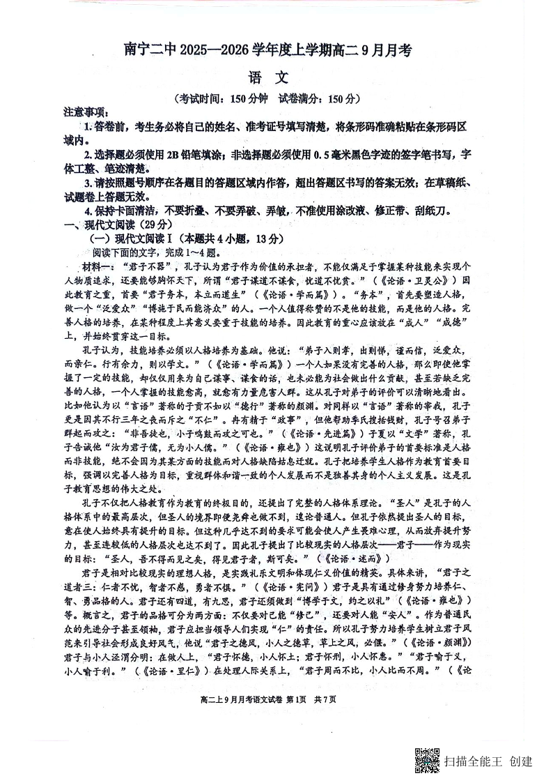 高二语文--广西南宁二中2025-2026学年上学期高二9月月考