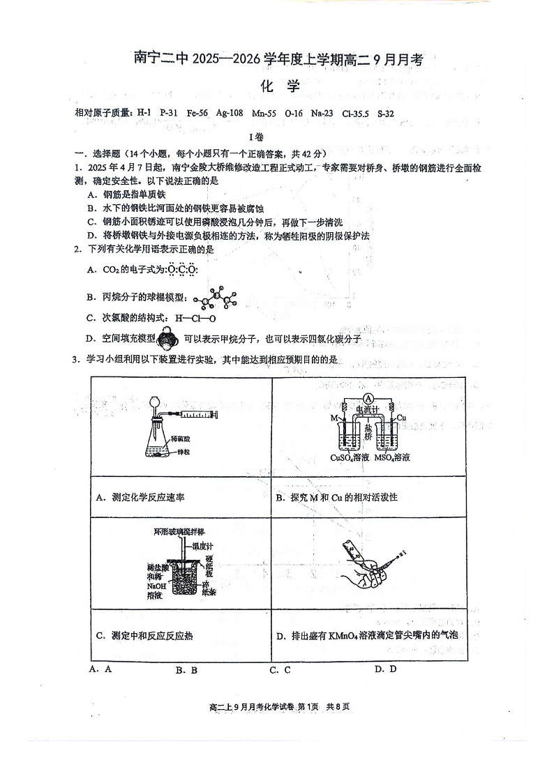 高二化学--广西南宁二中2025-2026学年上学期高二9月月考